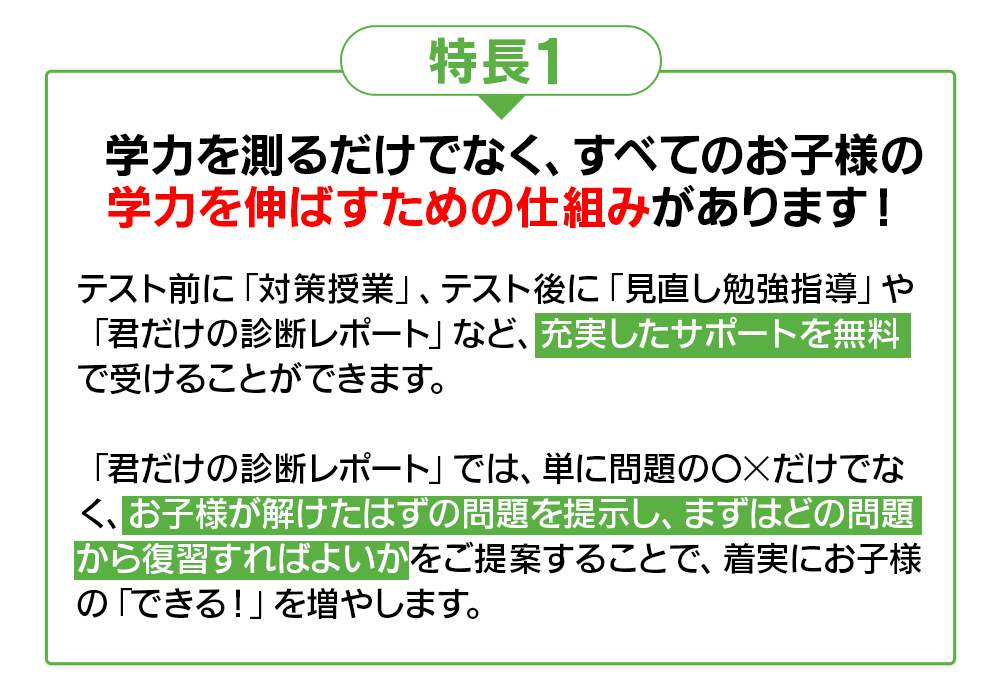 テスト前には対策授業、テスト後には見直し勉強指導などの学習サポートを受けることができます!