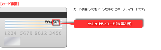 ▼ セキュリティコードとは クレジットカード決済を利用して購入手続きをする際に、クレジットカード番号とは別に、カード裏面に印字されている末尾3桁(AMEXの場合は表面の4桁)の数字を入力してもらうことで、本人認証を行うサービスです。 ※カード会社により表示箇所および名称が異なります。