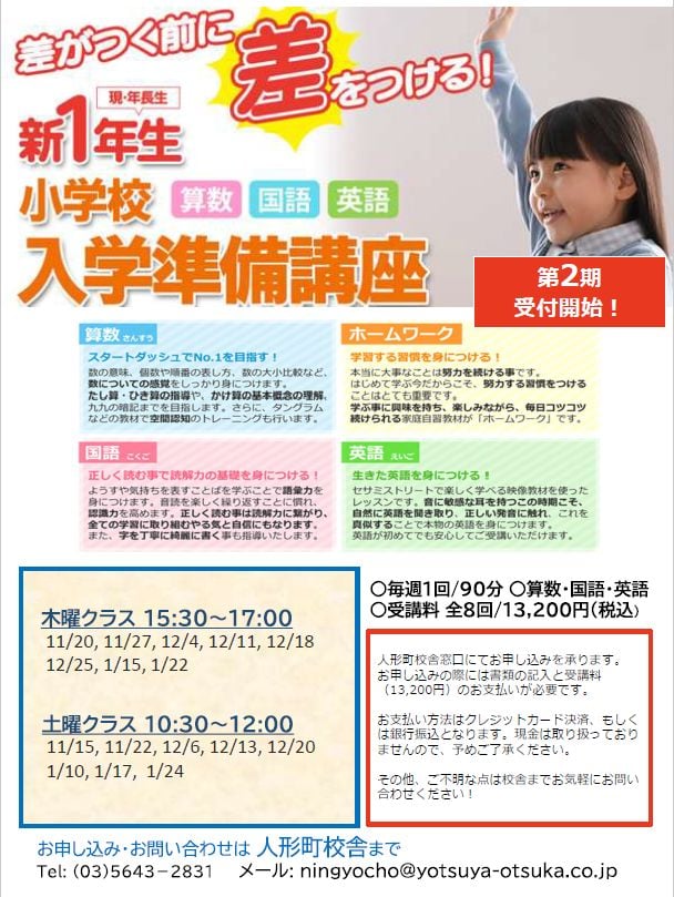 今年度も四谷大塚では年長のお子様を対象とした『新1年生小学校入学準備講座』を開講いたします。