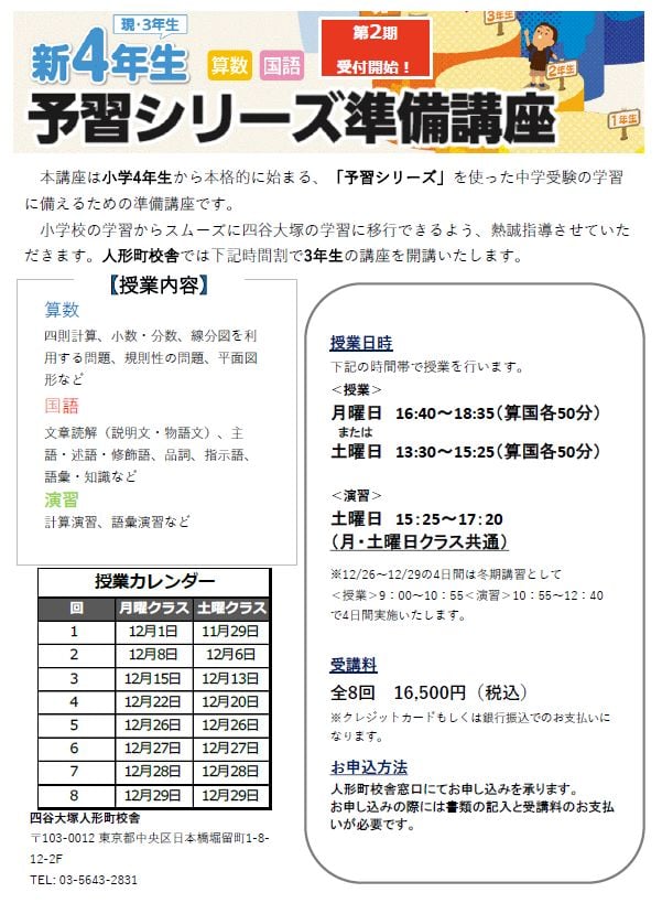 今年度も四谷大塚では3年生のお子様を対象とした『新4年生予習シリーズ準備講座』を開講いたします。