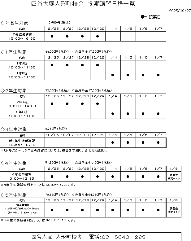 四谷大塚人形町校舎では2025年12月、2026年1月の冬休みの期間に冬期講習を実施いたします。