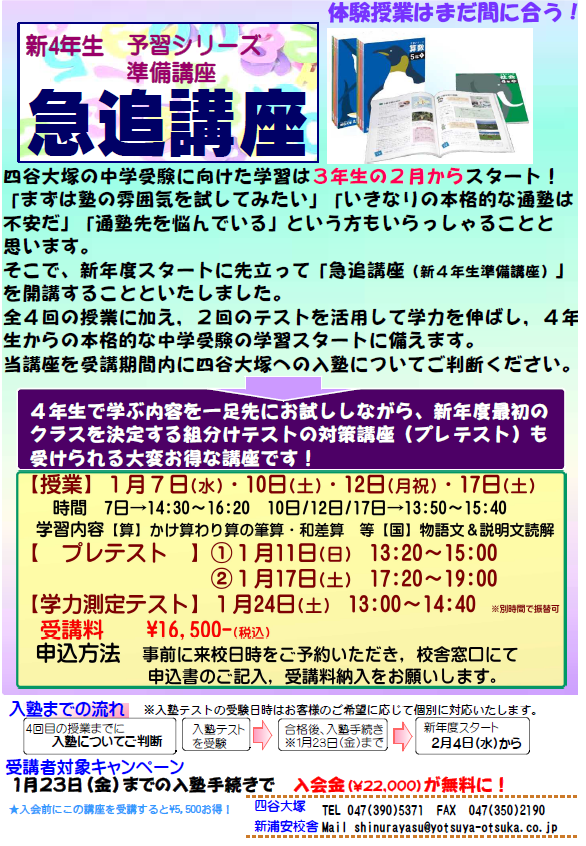 🌟新4年生(現3年生)対象 予習シリーズ準備講座急追講座のご案内🌟