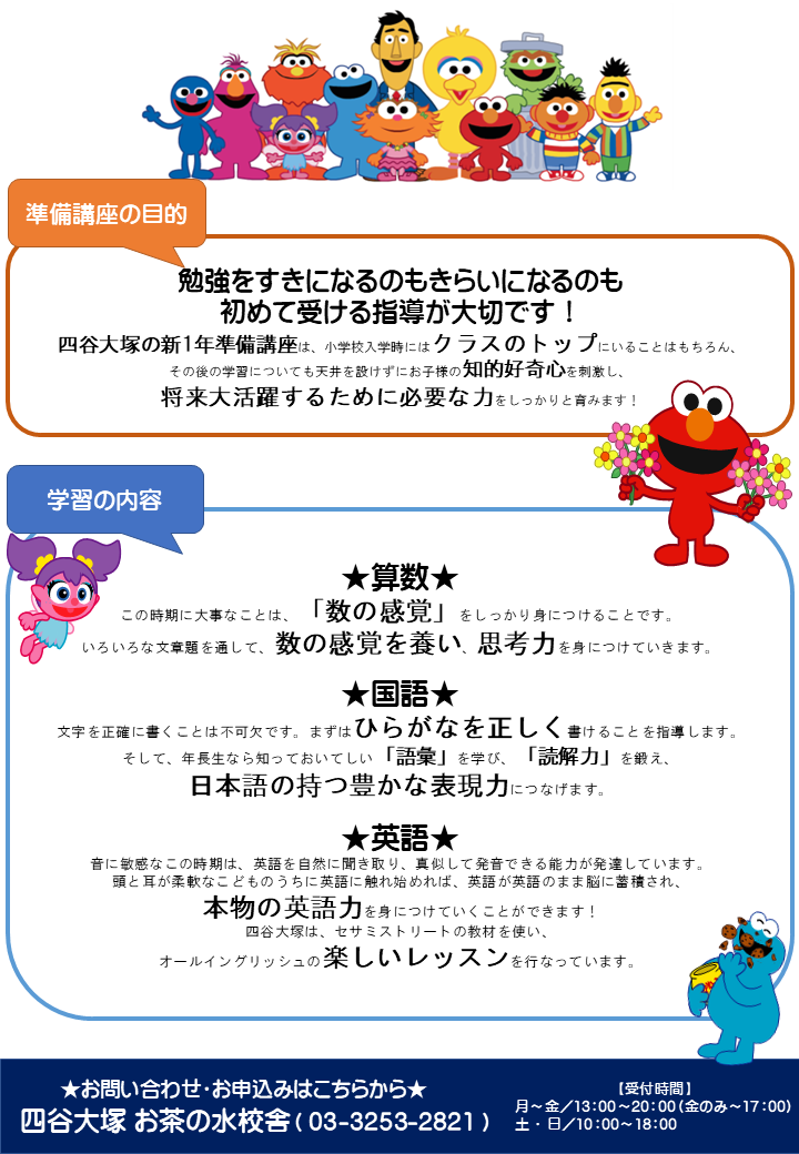 四谷大塚お茶の水校舎では、来年の4月から小学校に進学される