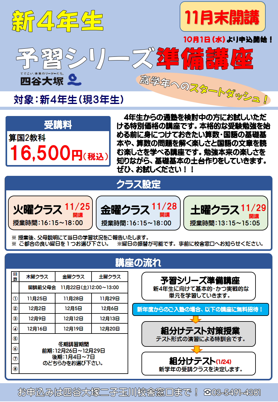 大人気講座の「新4年生 予習シリーズ準備講座」の第2期が開講いたします。