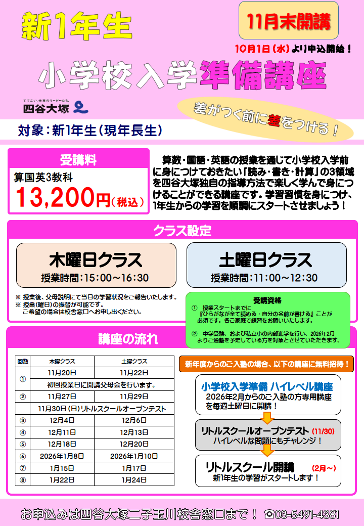 大人気講座の「年長生 小学校入学準備講座」の第2期が開講いたします。