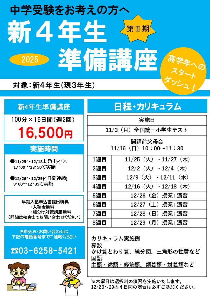 ※実際にご入塾いただくにはテストで合格する必要がございます。11/3実施の全国統一小学生テストまたは11月以降毎月の入塾テストで判定いたしますのでご受験ください。