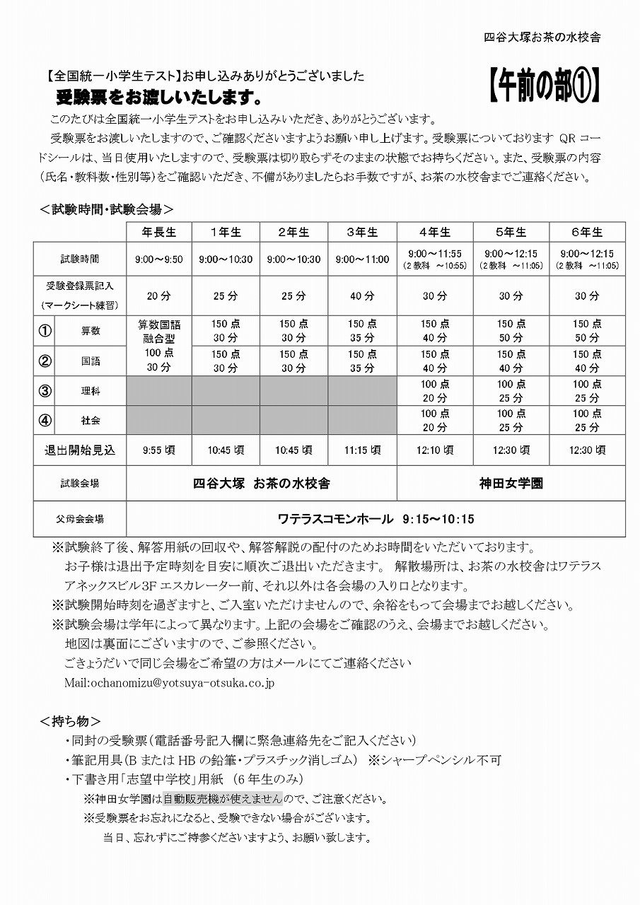 11/3(月)に行われる全国統一小学生テストで9:00~の回を受験される方は、