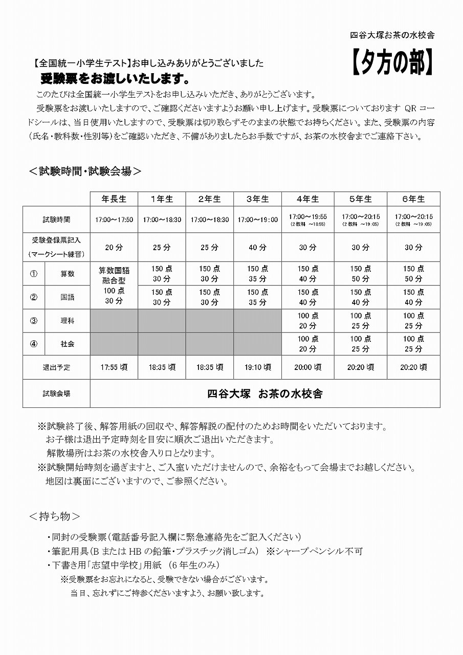 11/3(月)に行われる全国統一小学生テストで17:00~の回を受験される方は、