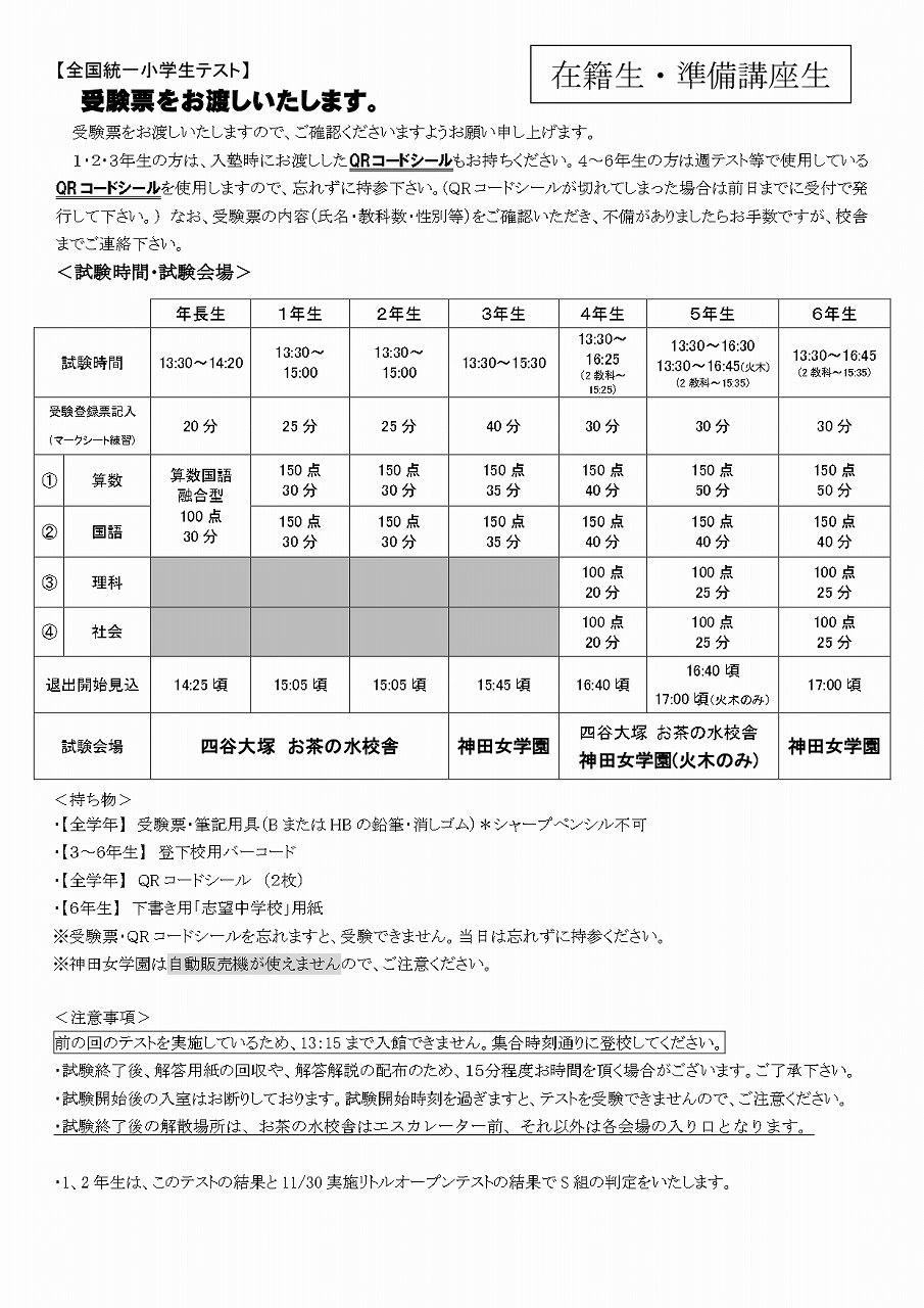 11/3(月)に行われる全国統一小学生テストで13:30~の回を受験される方は、
