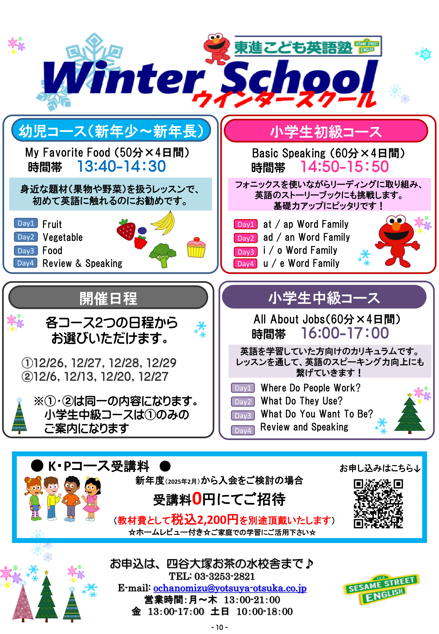 四谷大塚お茶の水校舎では、冬休み期間中にWinter Schoolを開催いたします。詳細は、下記のご案内をご覧ください。