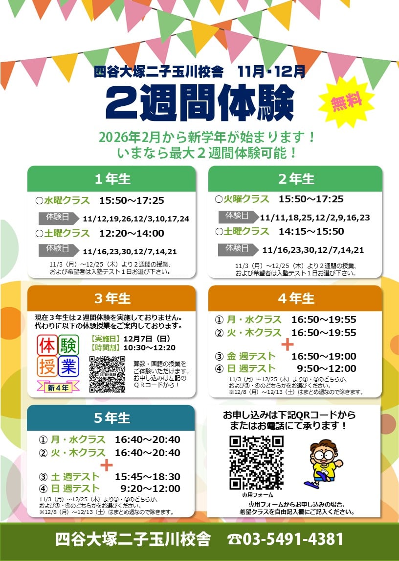 来年2月からの新年度にさきがけて、四谷大塚二子玉川校舎では2週間体験キャンペーンを実施いたします。