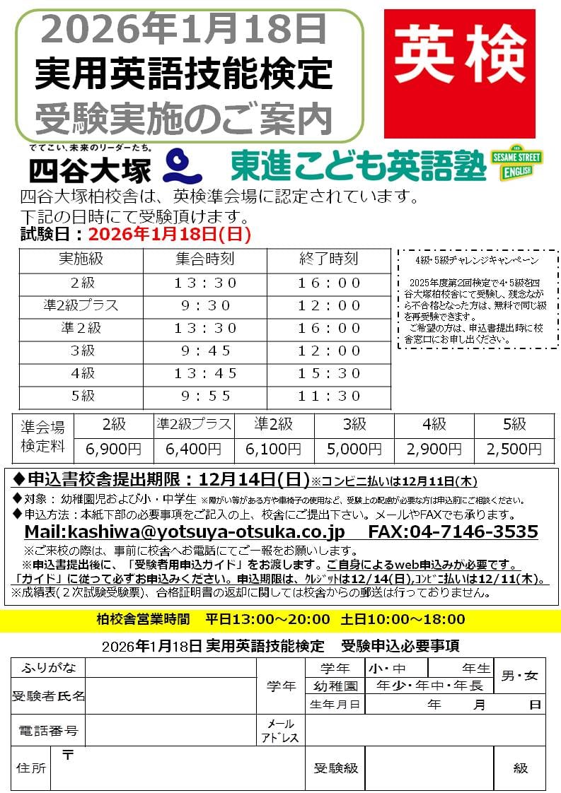 2026年1月18日(日)に柏校舎では英語検定(2~5級)を実施予定です。 お申し込みは、以下の申し込み書をご利用下さい。
