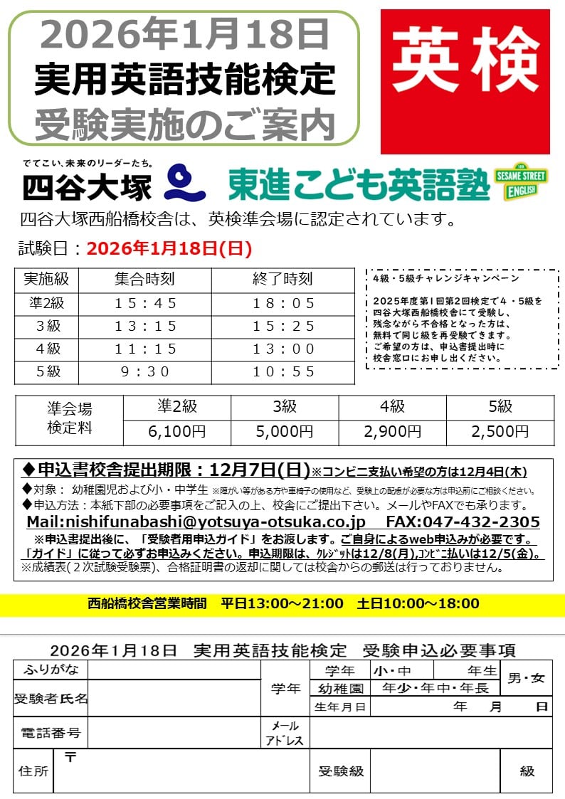 1/18(日)に西船橋校舎では実用英語技能検定(準2~5級)を実施予定です。 お申し込みは、以下の申込書をご利用下さい。