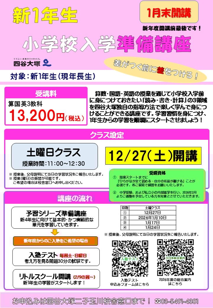 大人気講座の「新1年生 予習シリーズ準備講座」の第3期が開講いたします。