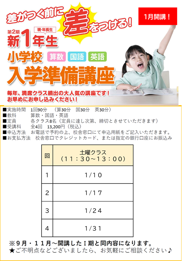 センター南校舎では、1月から年長生を対象に『新1年生準備講座』を開講いたします!