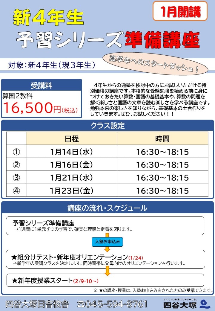 3年生の2月から始まる中学受験のカリキュラムに向けて、1月より新4年生予習シリーズ準備講座の第3期を開講します。