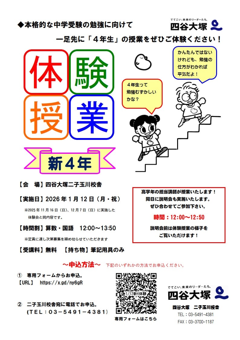 四谷大塚二子玉川校舎では2026年2月より新4年生の授業が開講いたします。