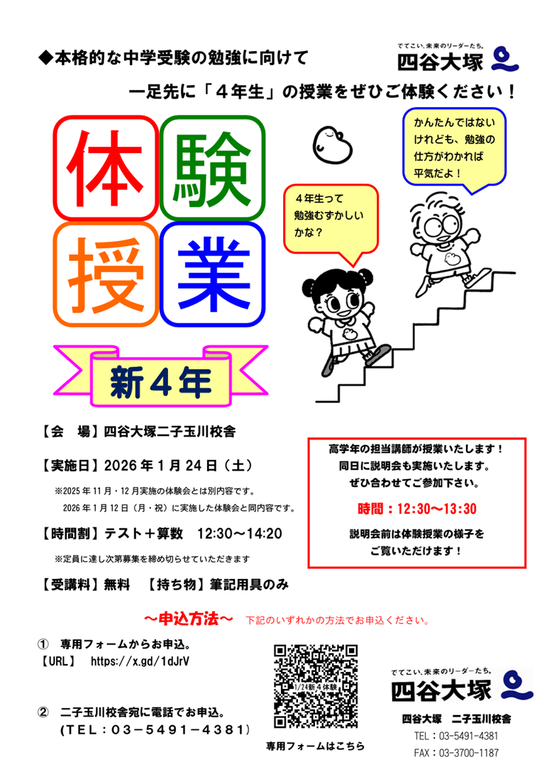 四谷大塚二子玉川校舎では2026年2月より新4年生の授業が開講いたします。