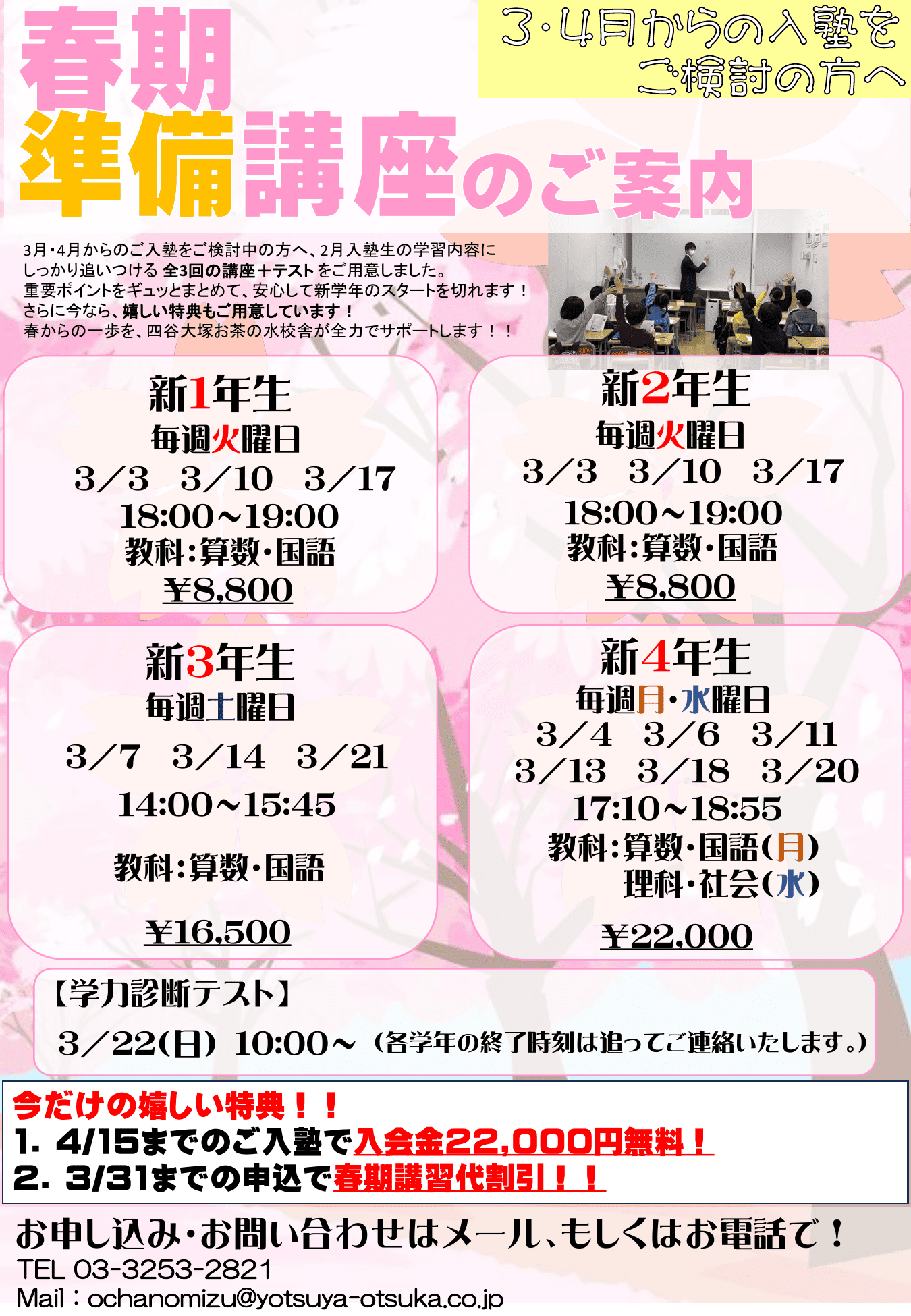 四谷大塚お茶の水校舎では、春期準備講座を開催いたします。詳細は、下記のご案内をご覧ください。