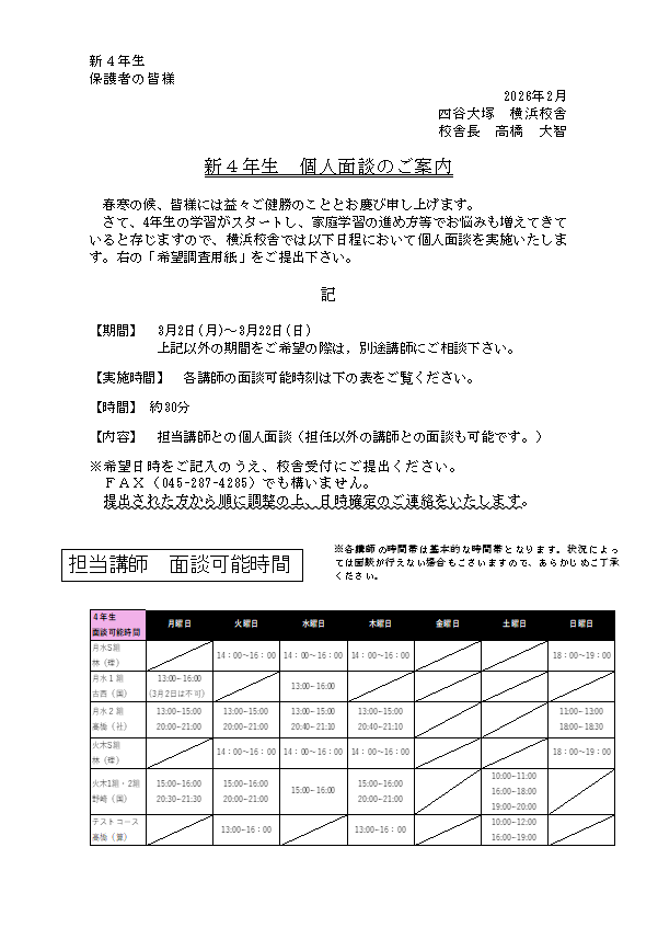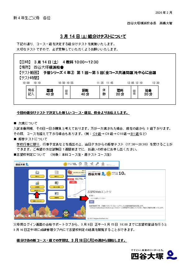 ・4年生対象 3月14日(土)組分けテストについてのご案内