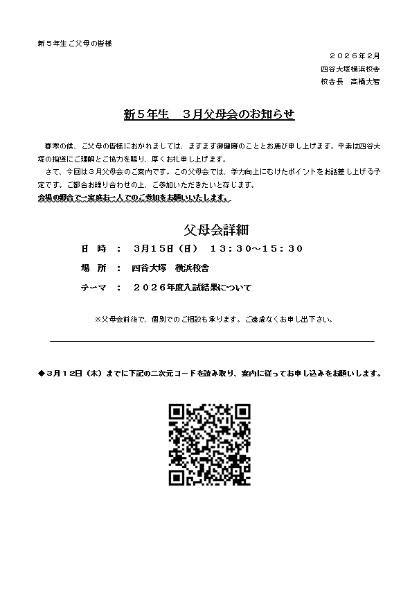 ・5年生対象 3月15日(日)組分けテストについてのご案内