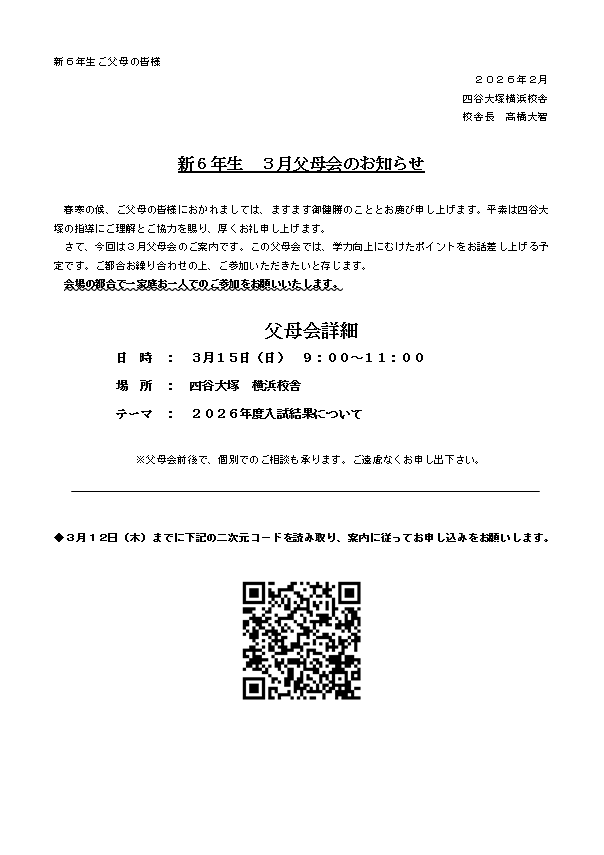 ・6年生対象 3月15日(日)組分けテストについてのご案内