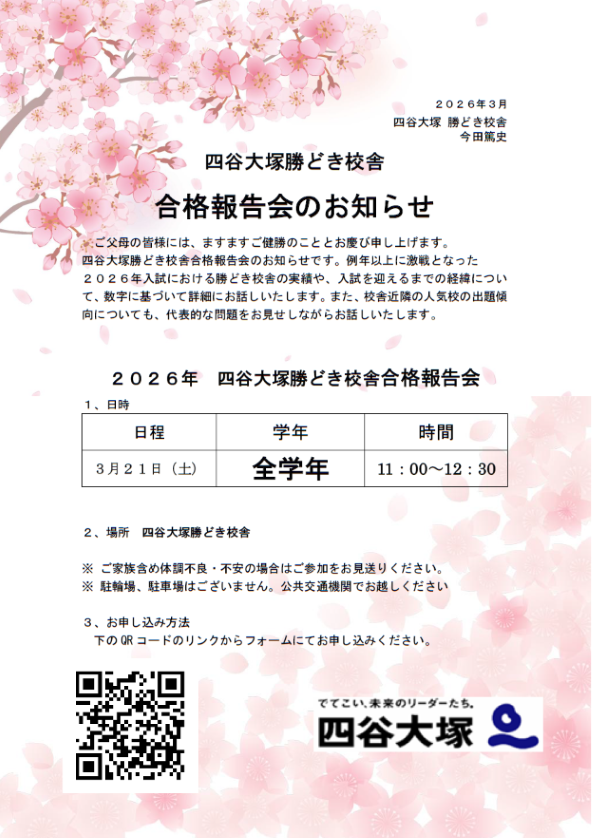 四谷大塚全体だけでなく勝どき校舎の取り組みや結果を含めた合格報告会を行います。