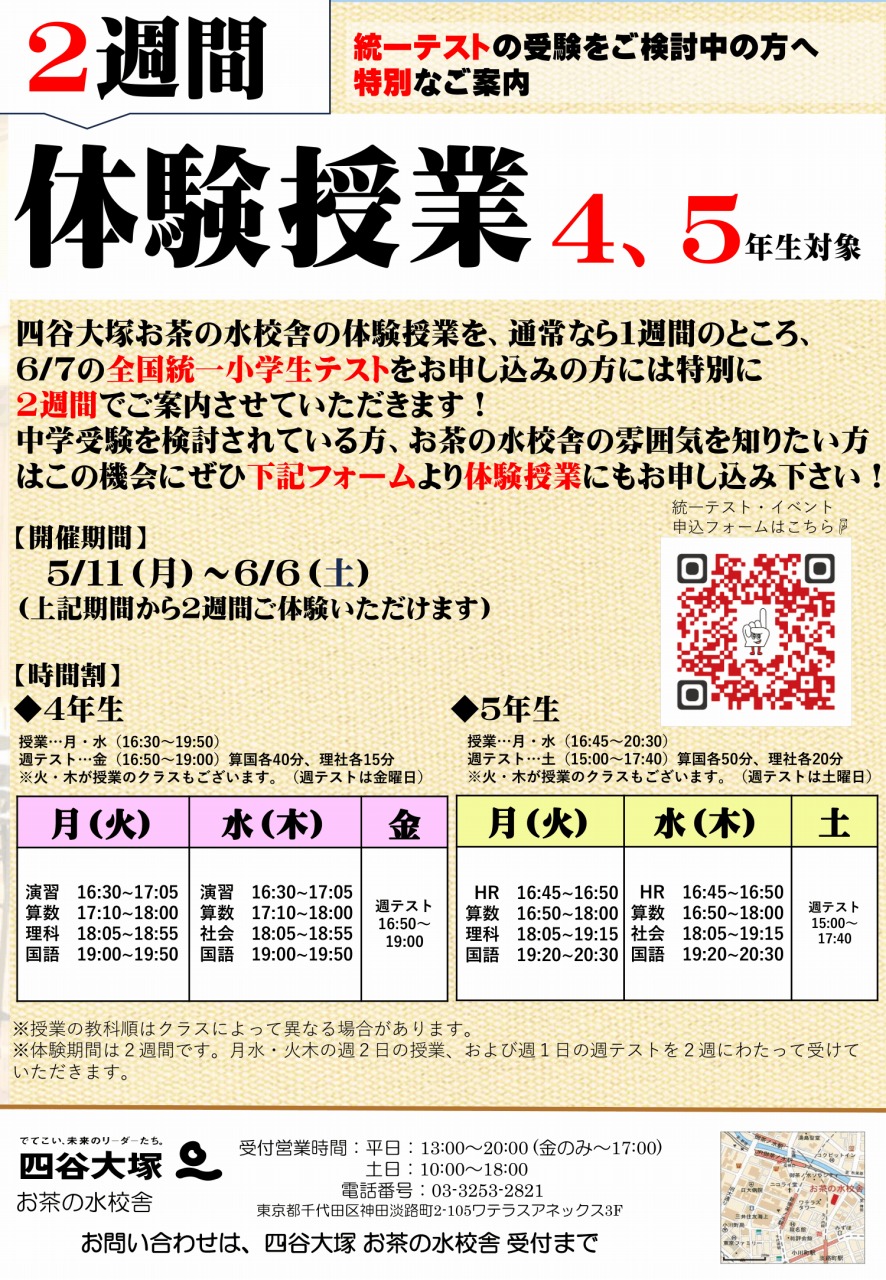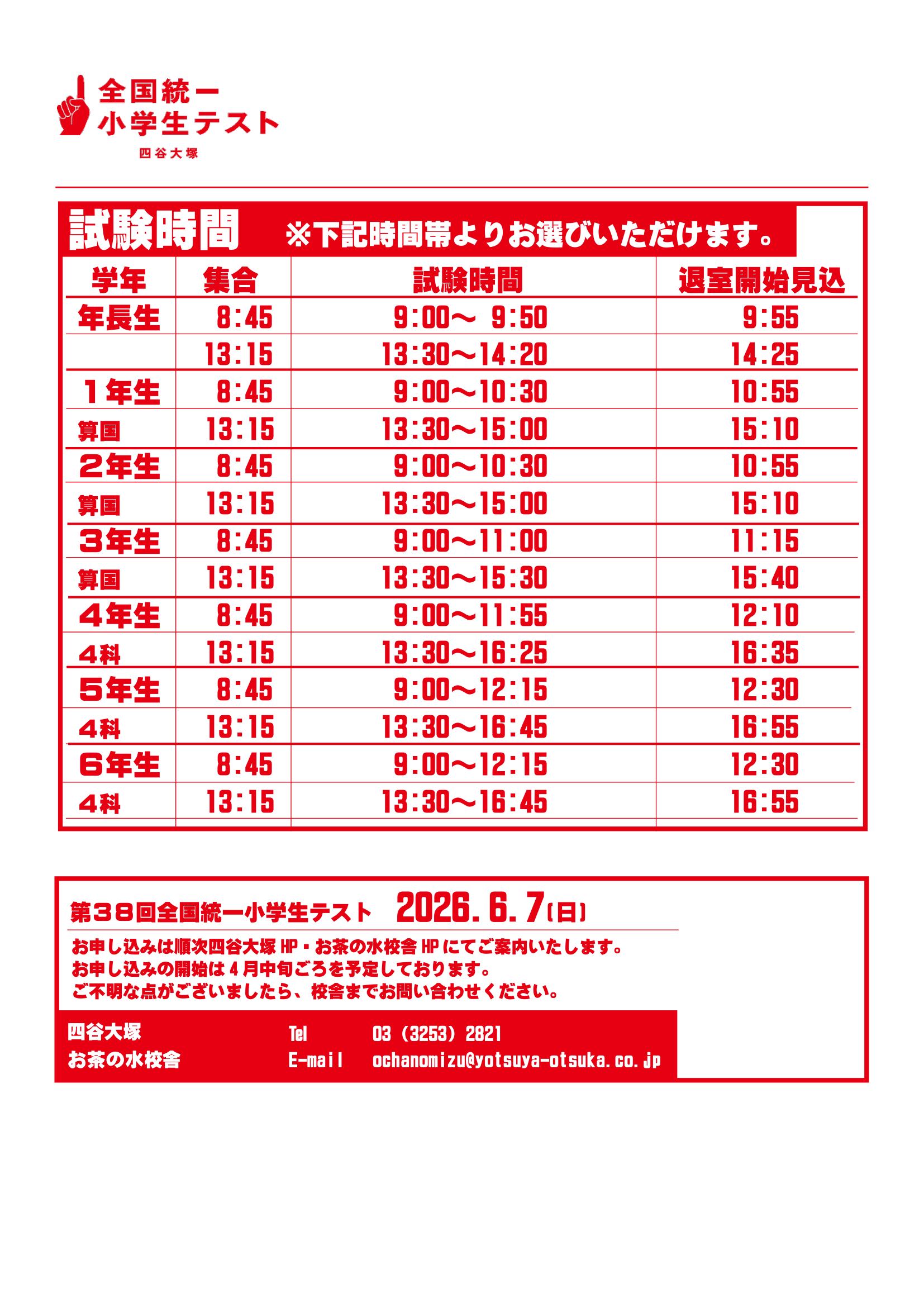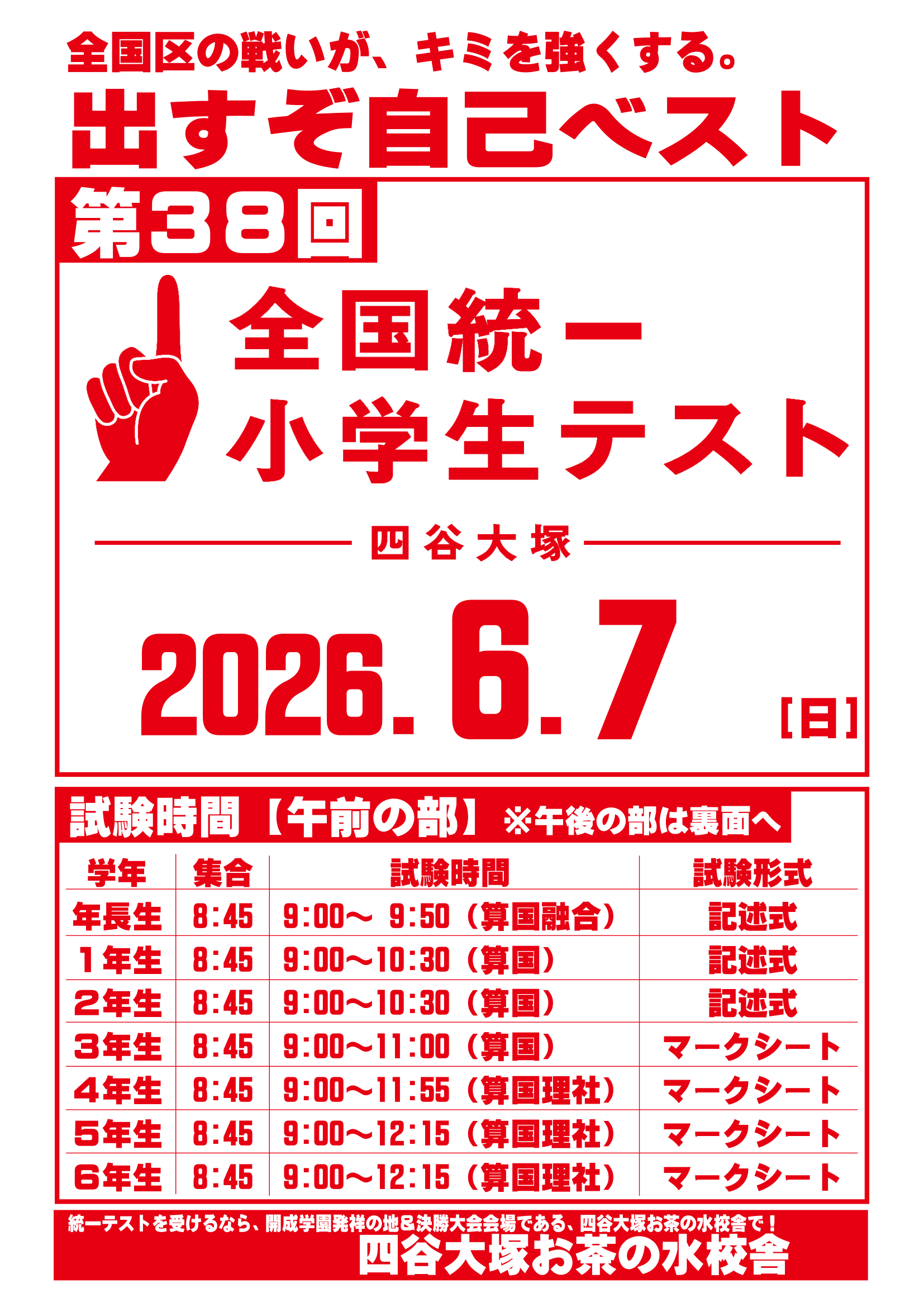 四谷大塚では、6月7日(日)に全国統一小学生テストを実施いたします。