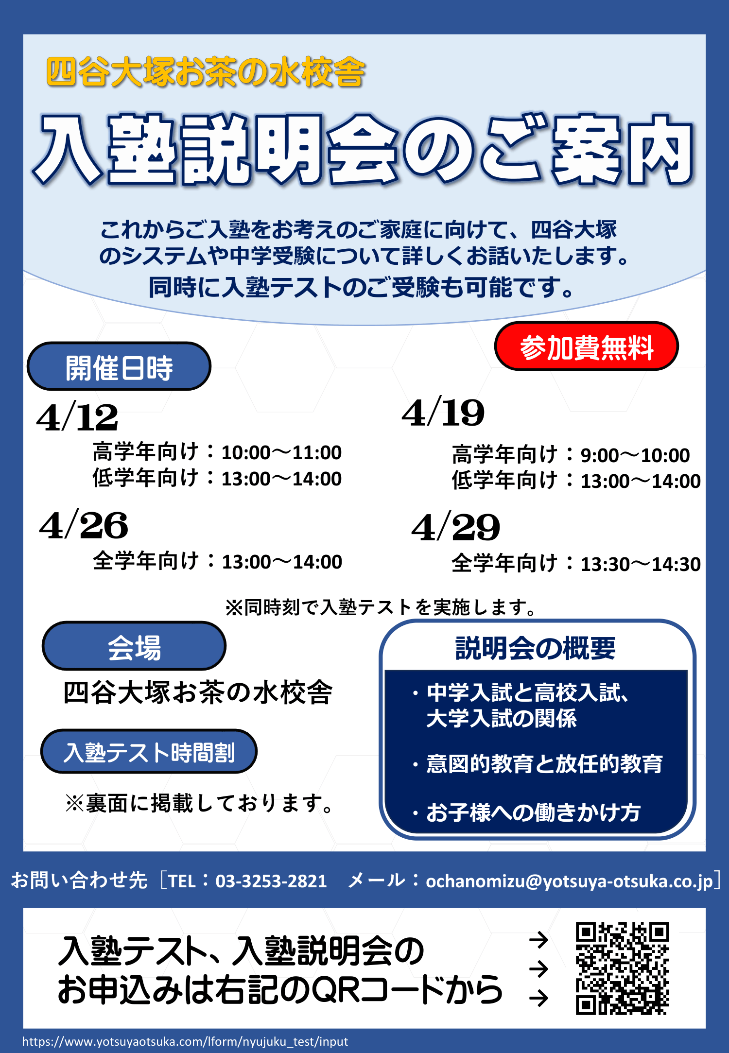 四谷大塚のシステムだけではなく、中学受験のご説明もございますので、ぜひお気軽にご参加いただければ幸いです。