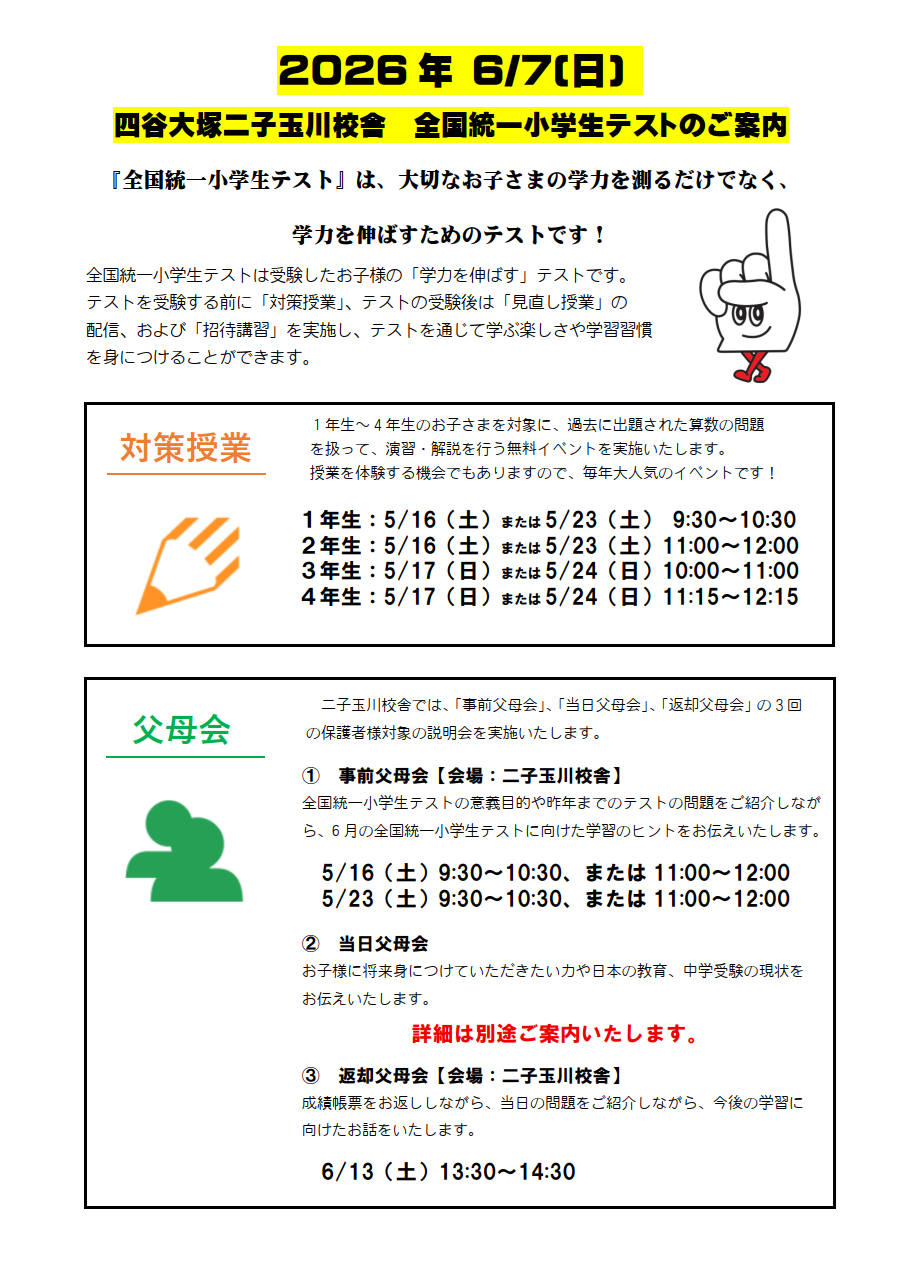 また、二子玉川校舎では、事前対策授業や父母説明会など、テストに向けた事前イベントも実施予定です!