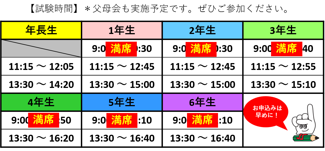 9時の回が全学年満席となっております!