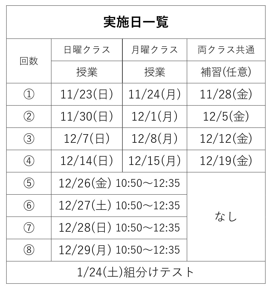 所沢校舎の設定クラスは以下の通りです。いずれかをお選びください。(定員各クラス10名程度)